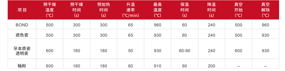 以上操作參數(shù)對使用者只是參考,如果燒結后的修復體表面特征,透性及光亮程度與理想狀態(tài)不一致,必須調整相應的燒結程序。燒結程序的決定因素不是烤瓷爐的顯示溫度,而是燒結對象燒結后的外觀及表面特性。